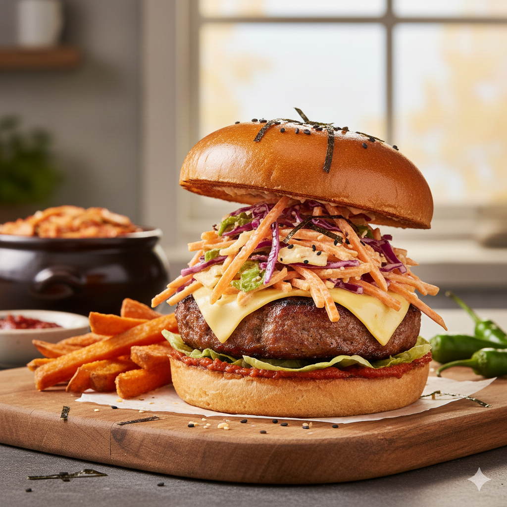 กิมจิไม่ได้เป็นแค่เครื่องเคียงในถ้วยเล็กๆ อีกต่อไป…ในโลกของอาหารยุคใหม่ ความคิดสร้างสรรค์คือกุญแจสำคัญที่เปลี่ยนวัตถุดิบดั้งเดิมให้กลายเป็นปรากฏการณ์ทางรสชาติ วันนี้เราจะนำ “กิมจิ” มาเป็นวัตถุดิบหลัก (The Star of the Dish) โดยการ Reimagine ใหม่ผ่านเมนู “เบอร์เกอร์หมูคุโรบูตะ กิมจิโคลสลอว์” ในจานนี้ กิมจิจะไม่ใช่แค่ตัวประกอบ แต่คือตัวกำหนดทิศทางของรสชาติทั้งหมด เราดึงเอา “ความลึก” ของรสสัมผัสจากการหมักบ่ม ทั้งความเปรี้ยวที่สดชื่น ความเผ็ดที่พอดี และความนัว (Umami) มาถ่ายทอดผ่าน “กิมจิโคลสลอว์” สูตรเข้มข้น เพื่อให้ทำหน้าที่ควบคุมรสชาติของเนื้อหมูคุโรบูตะและชีสเยิ้มๆ ให้อยู่ในระดับที่สมบูรณ์แบบที่สุด นี่คือเมนูที่จะพิสูจน์ว่ากิมจิคือวัตถุดิบหลักที่สามารถยกระดับเบอร์เกอร์สู่ระดับพรีเมียมได้อย่างน่าทึ่ง