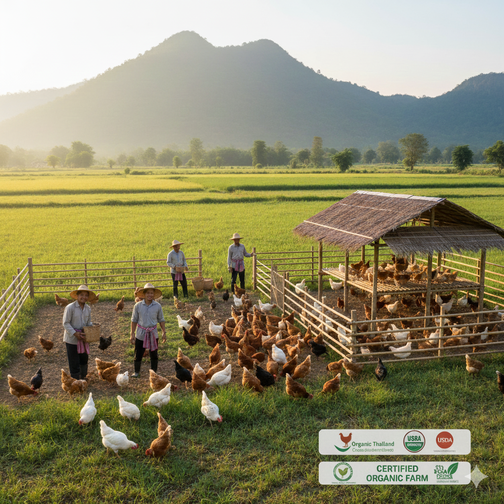 1. อาหารสัตว์ (Feed): ไก่ต้องได้รับอาหารที่มาจากวัตถุดิบอินทรีย์ 100% ที่ได้รับการรับรองเท่านั้น ห้ามใช้สารเคมี, ยาปฏิชีวนะ, ฮอร์โมน, หรือ GMOs